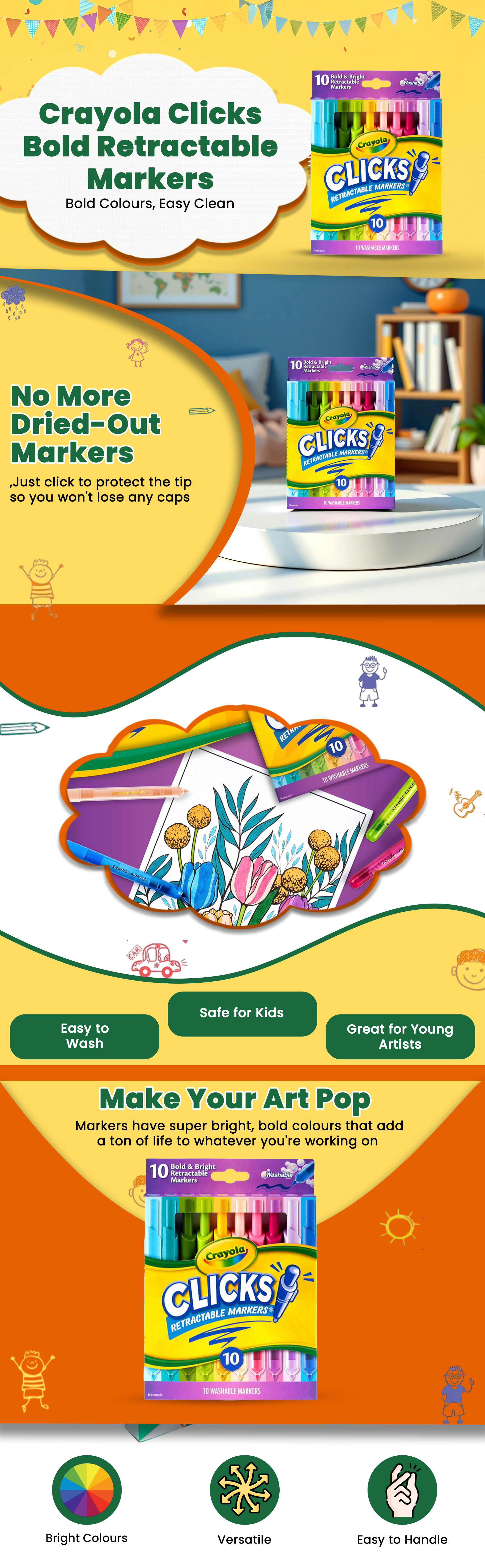 كرايولا ماركرز كليكس بولد قابلة للسحب للجنسين، 8-10 سنوات، مجموعة من 10 | متجر كانا