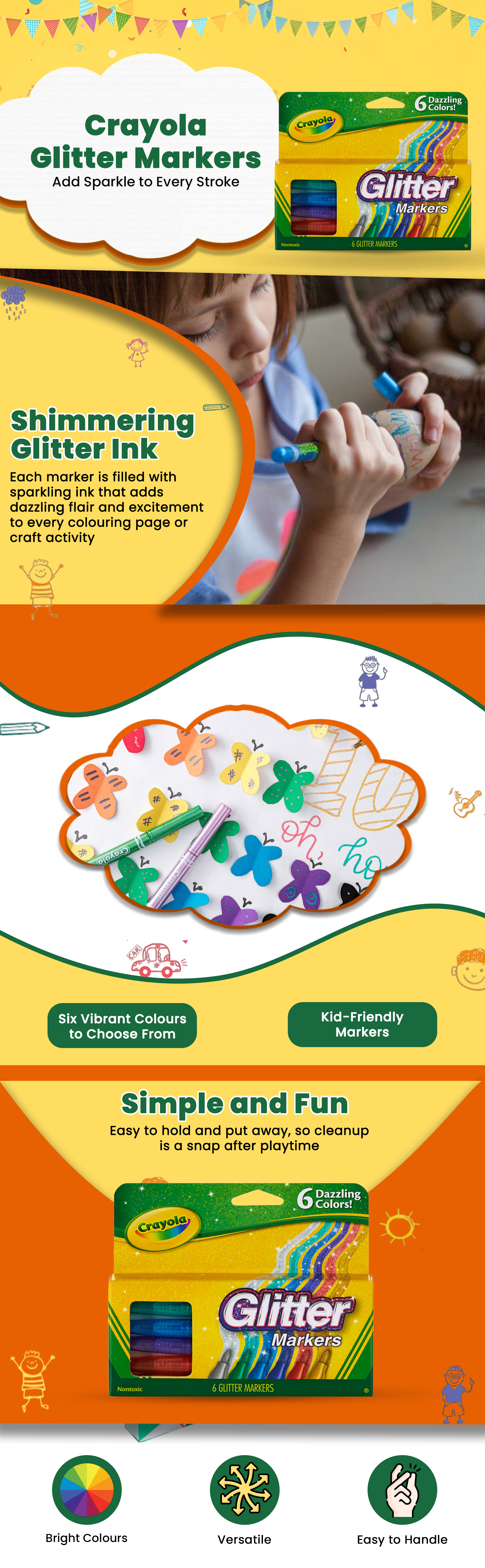 كرايولا ماركرز جليتر للجنسين، 5-7 سنوات، مجموعة من 6 | متجر كانا