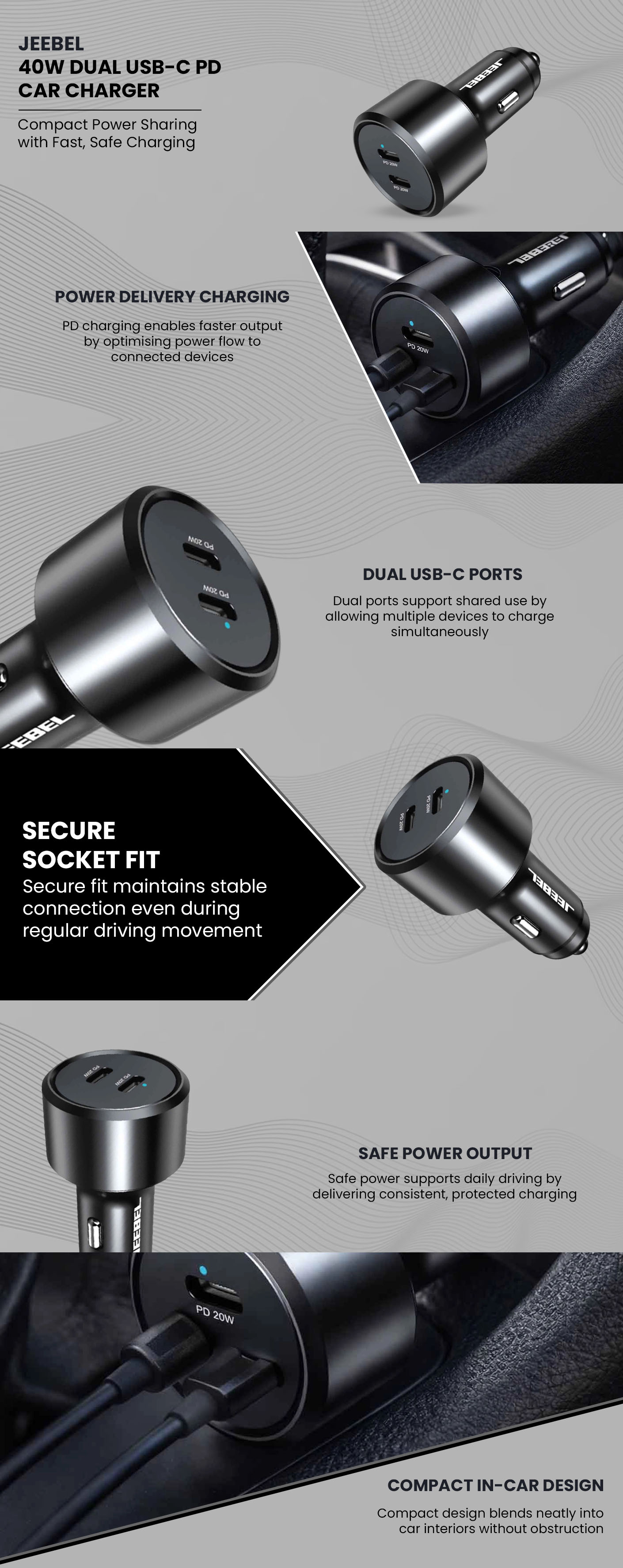 Jeebel Black 40W 2 Port USB-C PD Car Charger|The Kanaa