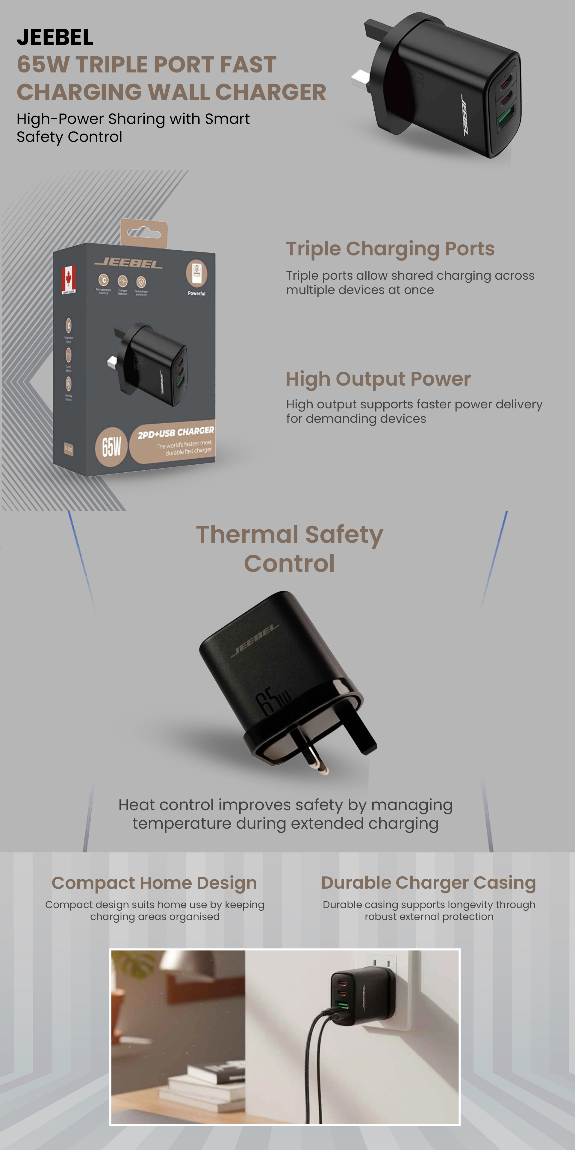 Jeebel Black 65W Dual USB-C PD & USB QC 3.0 Triple Port Fast Charging Wall Charger|The Kanaa
