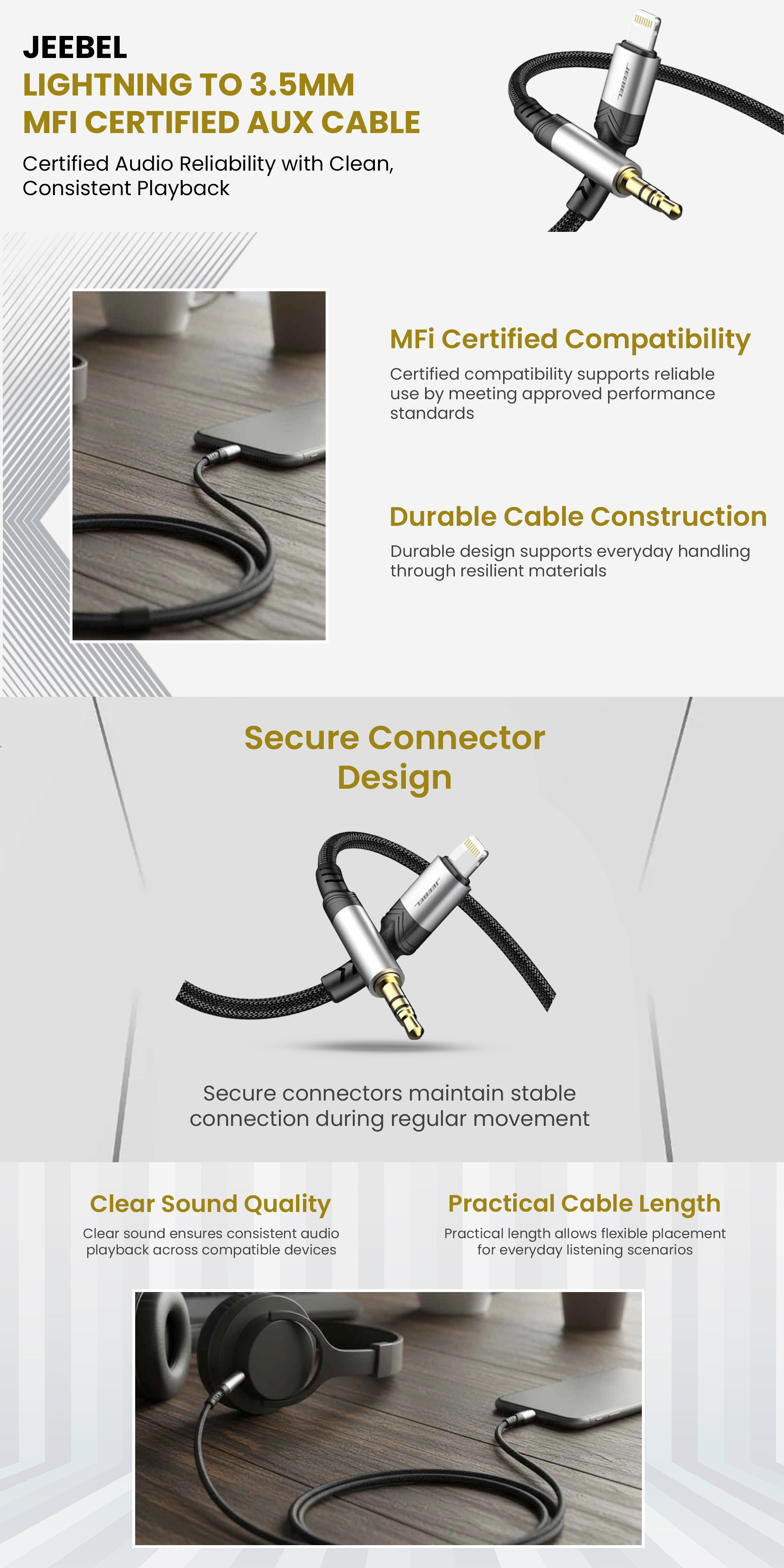 جيبل كابل AUX لايتنينغ إلى 3.5 مم بطول 1.2 متر معتمد MFi باللون الأسود | متجر كانا